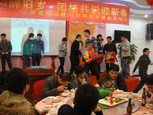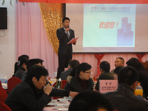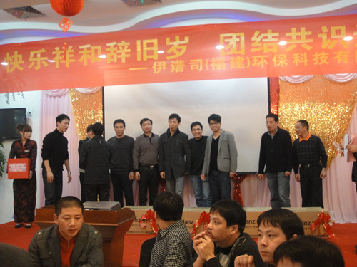 2013年元月20日,伊譜司(福建)環(huán)??萍加邢薰驹诟V蓰惛鄞缶频曷≈嘏e辦了“快樂(lè)祥和辭舊歲,團(tuán)結(jié)共識(shí)迎新春”的年會(huì),蒞臨光臨的有來(lái)自省內(nèi)67家設(shè)計(jì)單位、福建錦楠建設(shè)發(fā)展有限公司、福建鑫九洲建筑工程有限公司、福建時(shí)代家園裝飾工程有限公司等友好合作單位近300個(gè)嘉賓,參會(huì)的還有伊譜司各個(gè)地區(qū)的經(jīng)銷商代表。