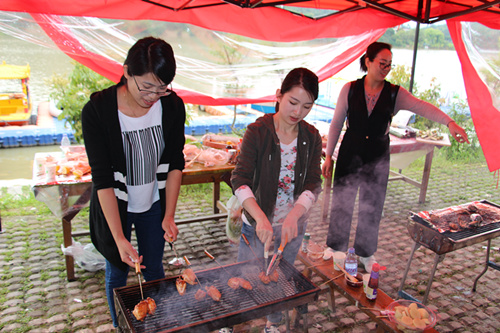 下車后,大家拎著大包小包的食材往燒烤區(qū)走沿途欣賞金水湖的景色。到了游客服務(wù)區(qū),幾個紙牌愛好者自行成隊(duì)玩起了十三水。大姐大們帶領(lǐng)大家擺桌,清洗食材,大家分工明確,互幫互助,一切都有序緊湊的進(jìn)行著,整個園子里充滿了大家的歡聲笑語。不知不覺也到了飯點(diǎn),準(zhǔn)備吃的過程真的很開心,但更開心的是吃的過程啊,你看他們的表情就知道了。這次活動雖然本命燒烤的許總不在,但是小周、宣總、陳出納跟鄭會計(jì)都漸入佳境,烤的越來越好,味道也調(diào)的一級棒,給辛苦付出的你們點(diǎn)贊,哈哈哈哈哈哈,我們吃的很開心。
